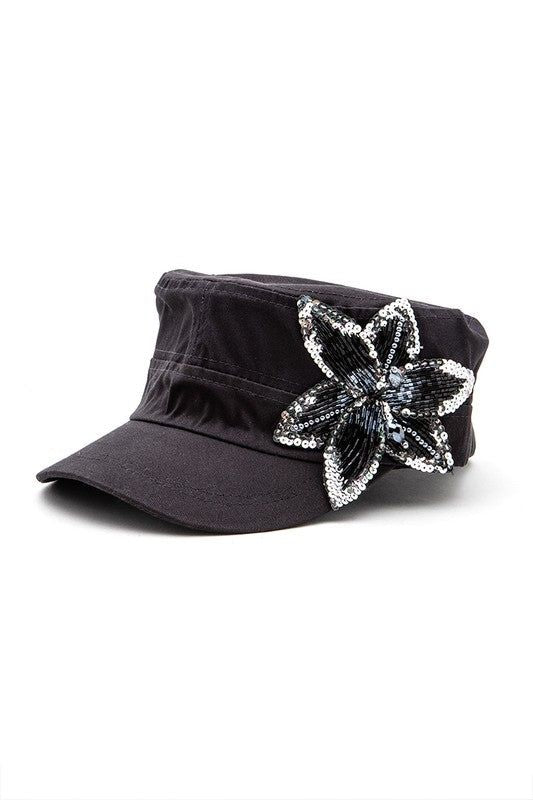 Cadet Hat Sequins Beaded 3D Flower Cotton Statement