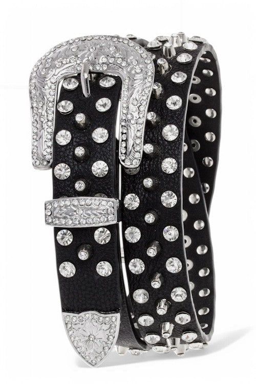 A modern, minimalist belt crafted from polyurethane with crystal accents, designed for a modern style wardrobe. This neutral accessory adds a subtle shine to outfits without overpowering them. It pairs nicely with fedora hat, wool fedora, and other minimalist hats for a cohesive, modern style look.